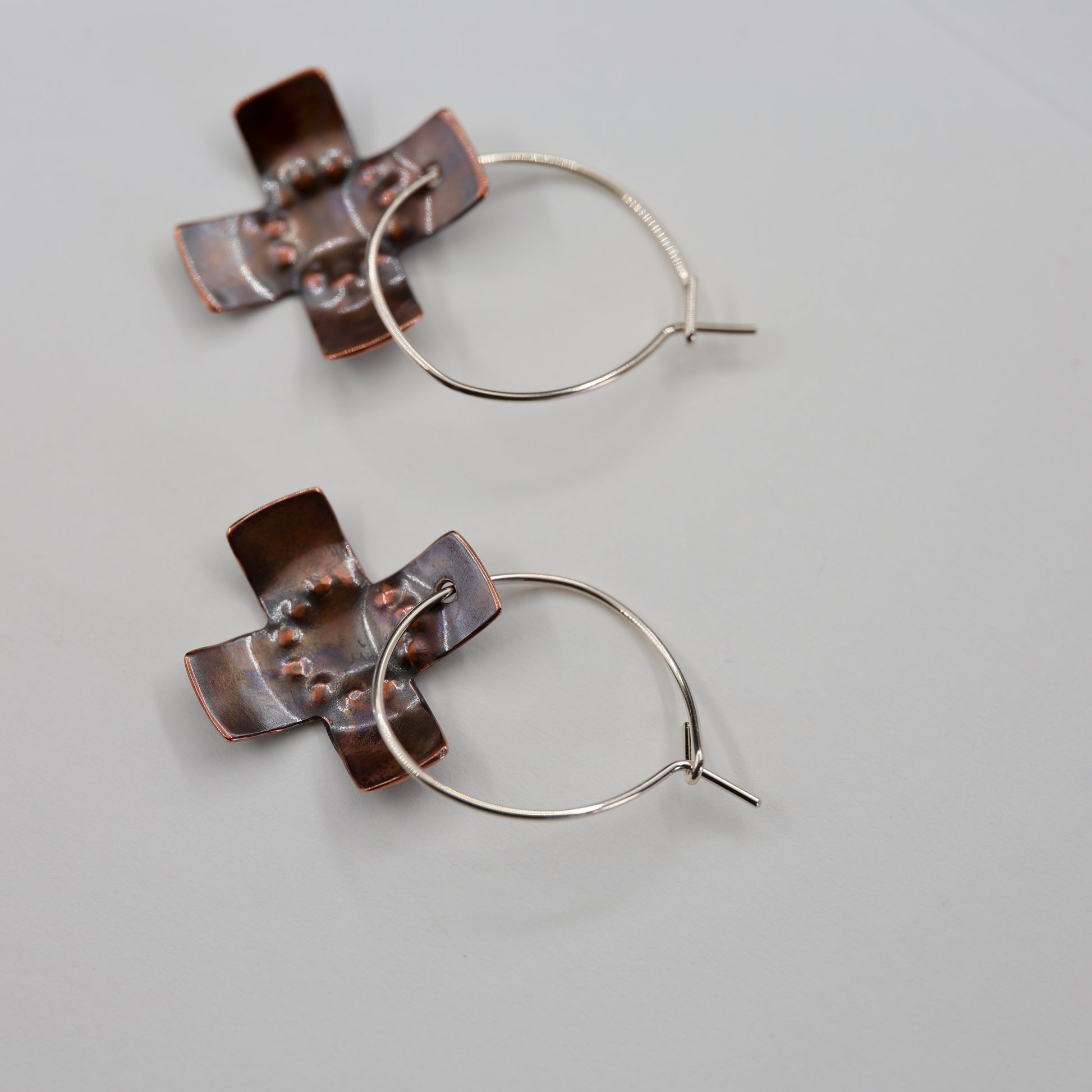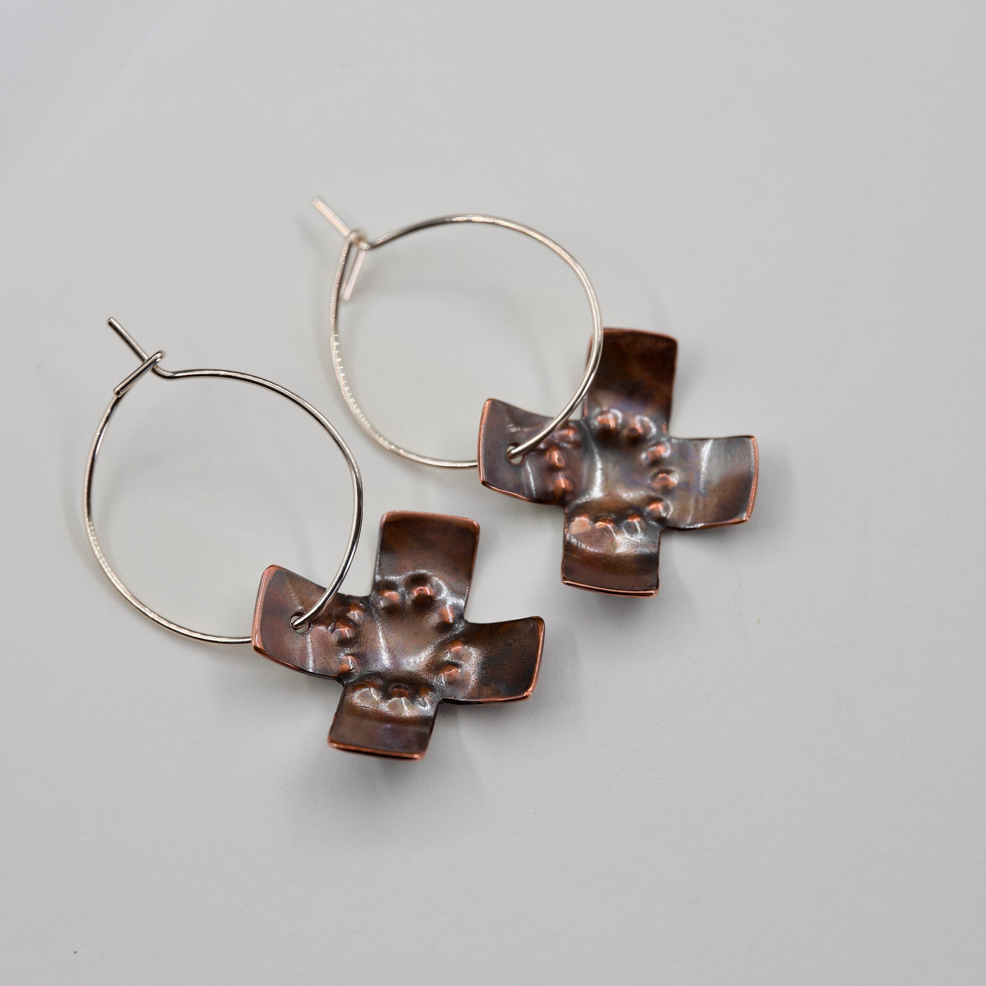 Copper cross hoop earrings, made with repurposed copper.