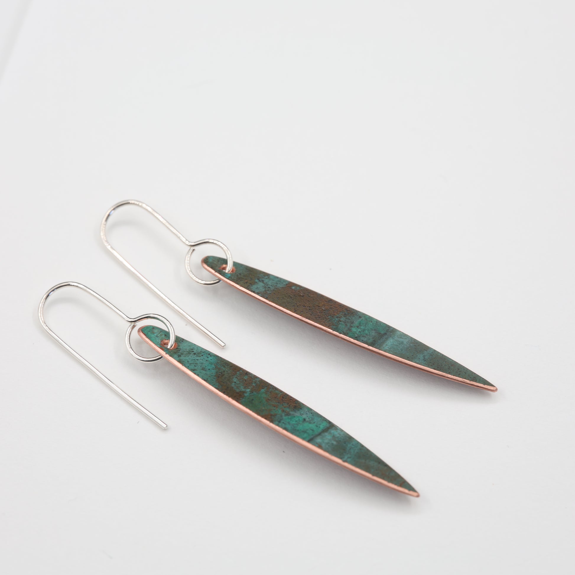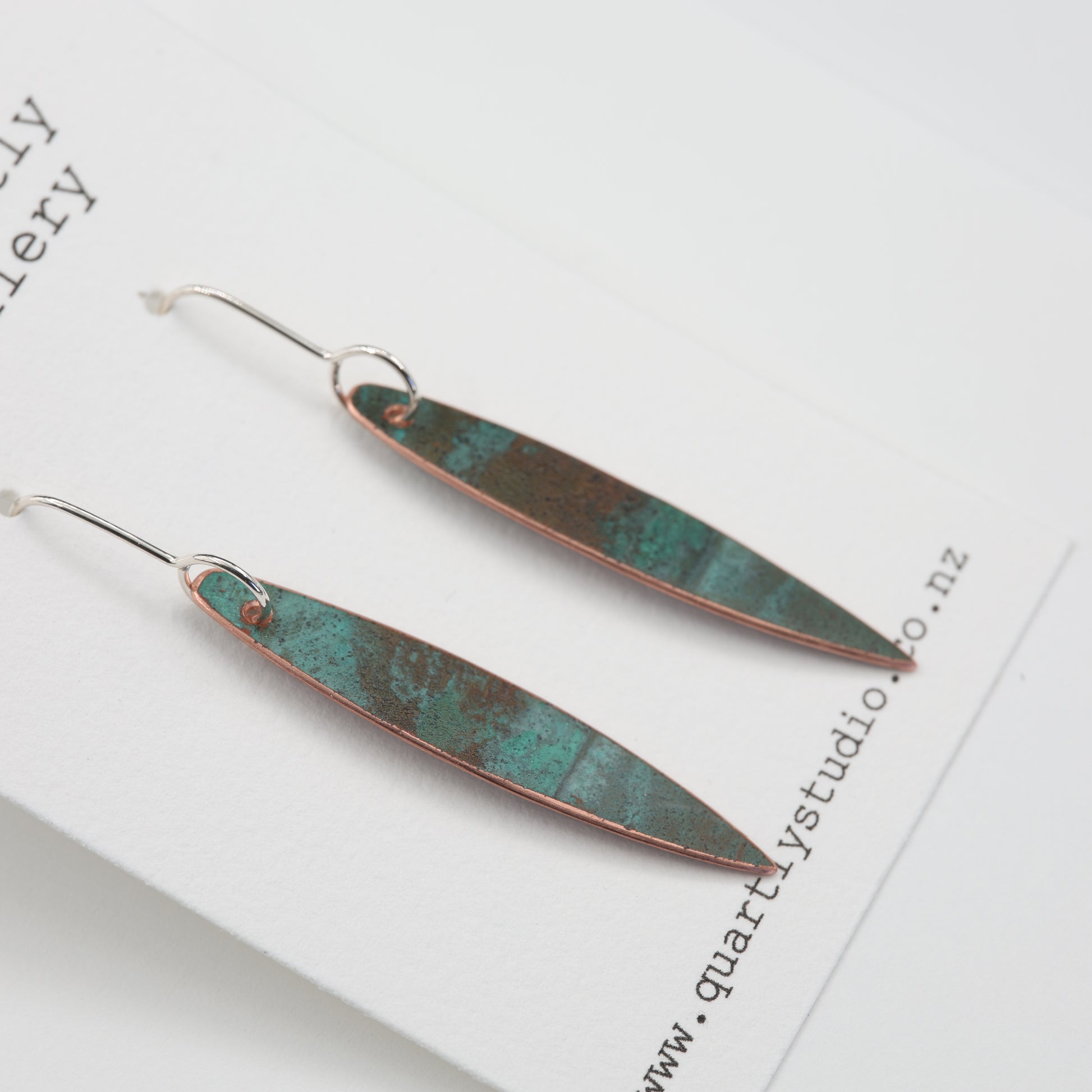 The copper has been soaked with different variations of vinegar and salt, then left to dry to create natural patterns and colours then sealed to make it last.