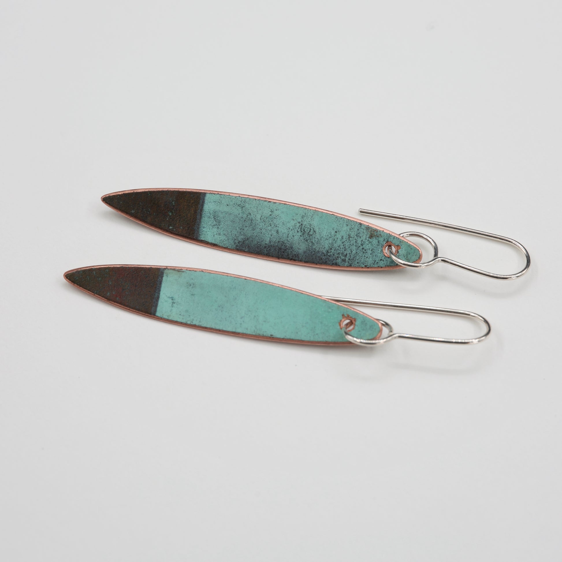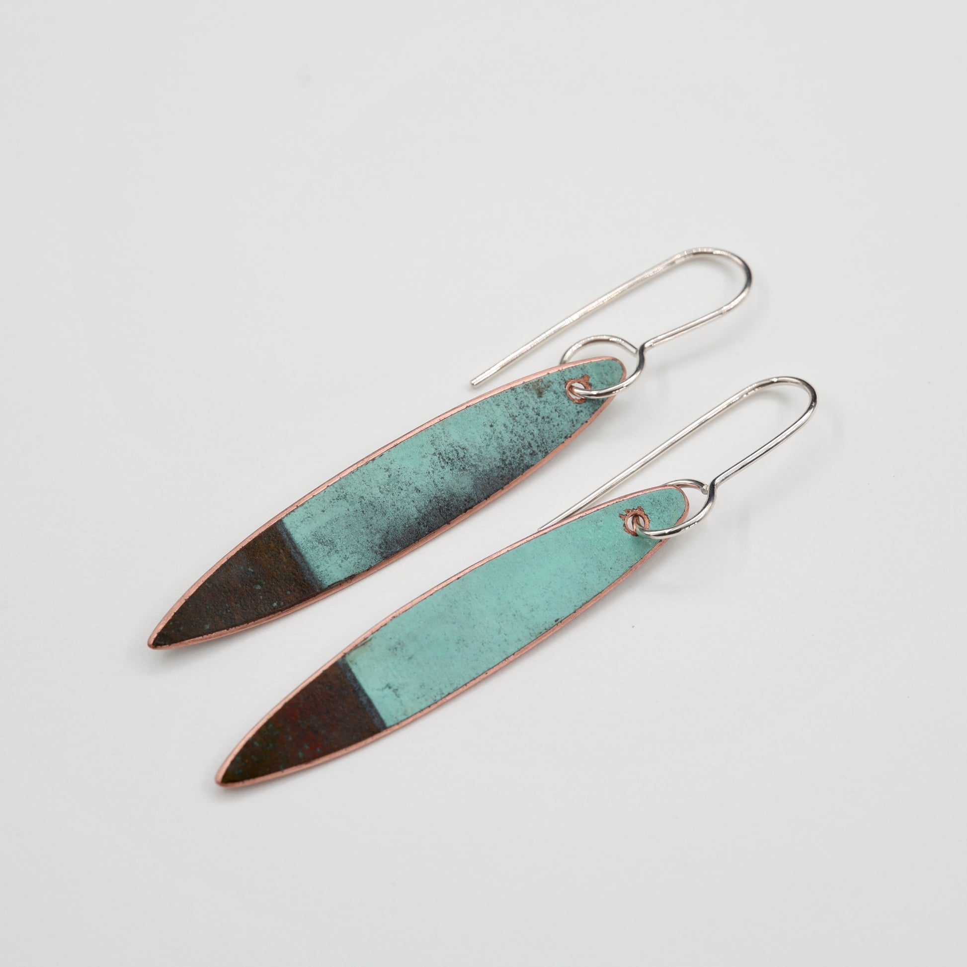 The copper has been soaked with different variations of vinegar and salt, then left to dry to create natural patterns and colours then sealed to make it last.