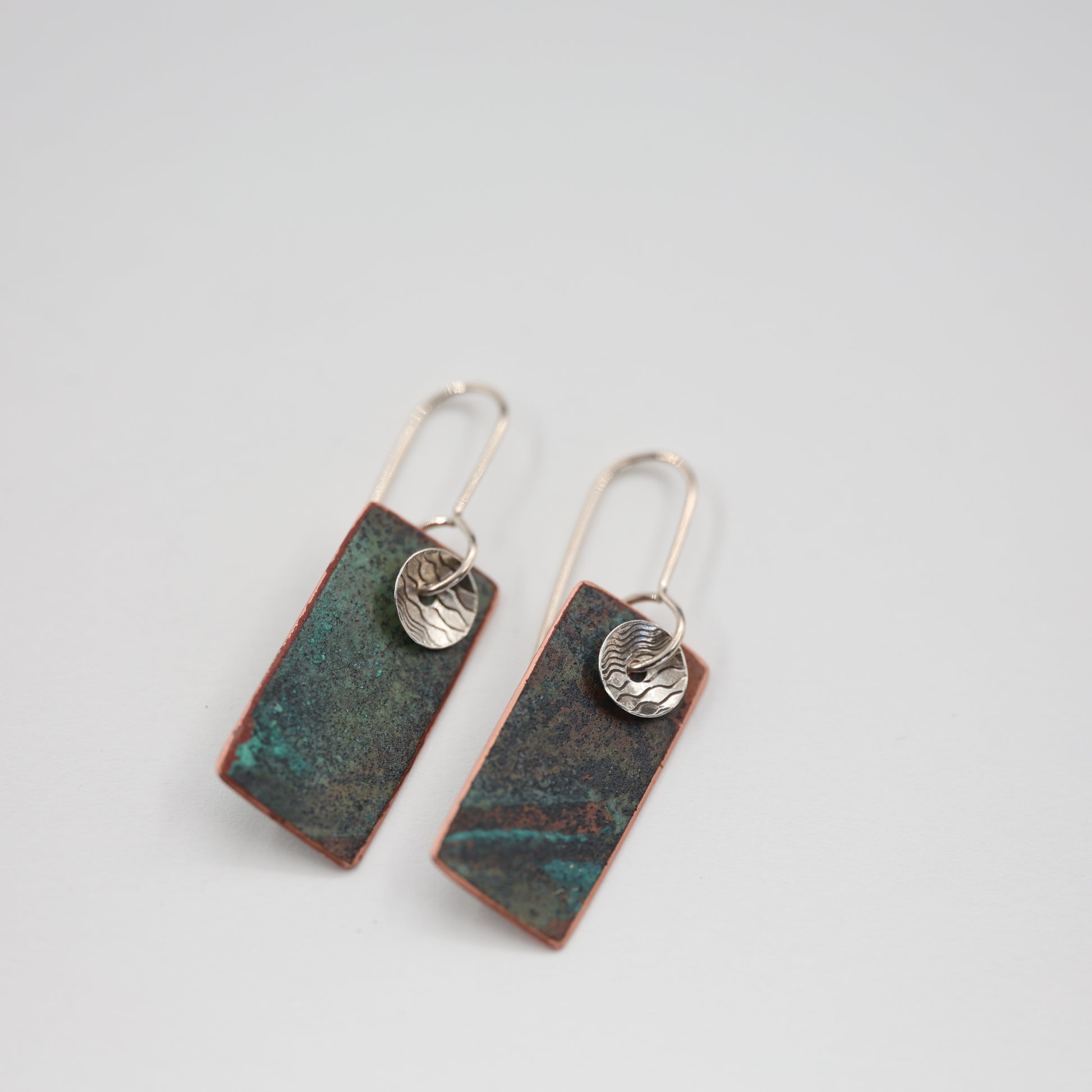 The copper has been soaked with different variations of vinegar and salt, then left to dry to create natural patterns and colours then sealed to make it last.