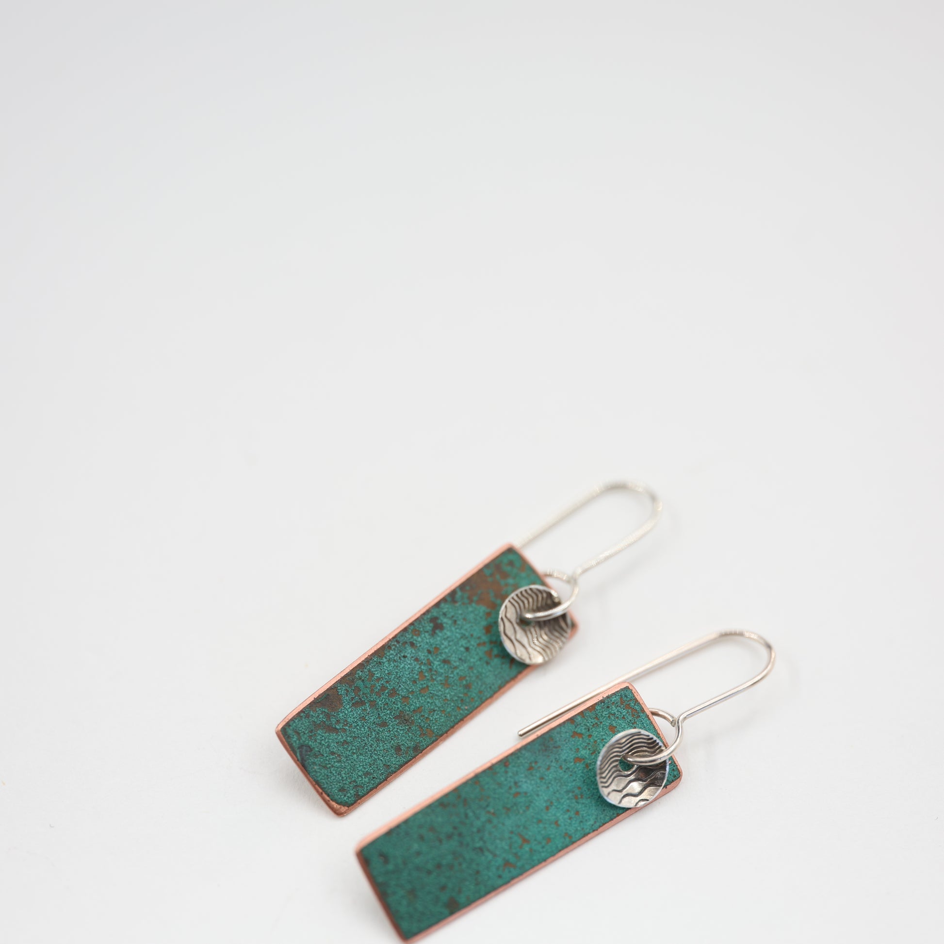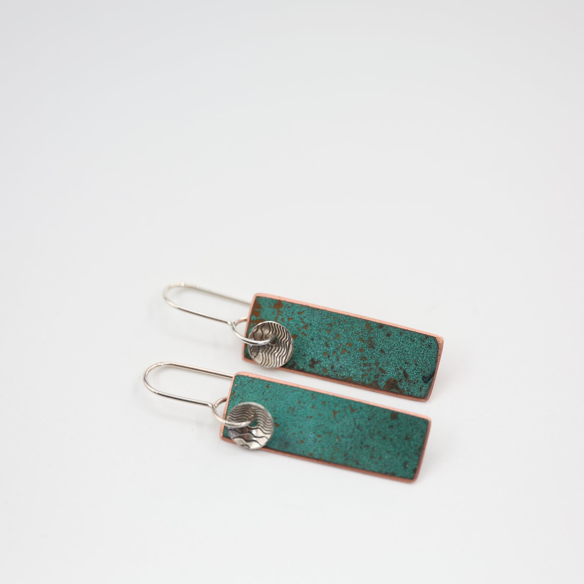 Natural patina design on repurposed copper with vintage silver disc.