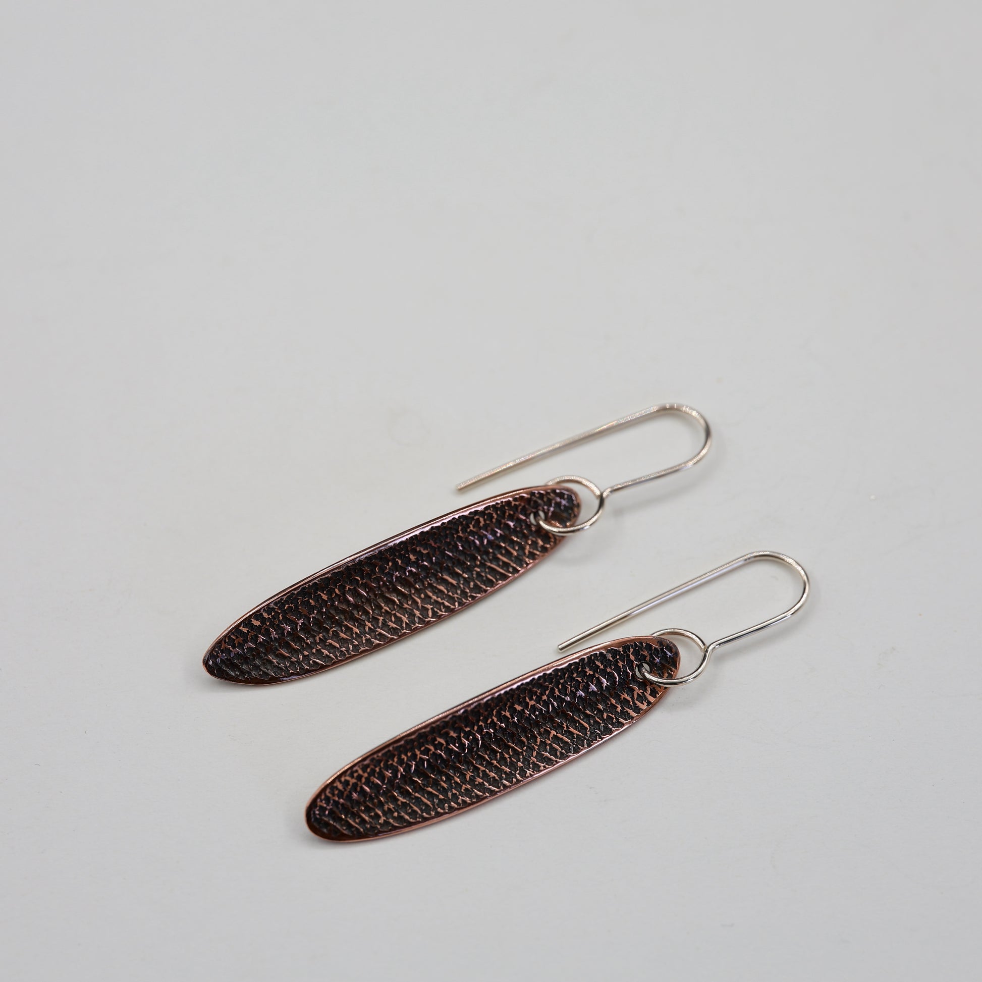 Textured copper leaf earrings made with repurposed copper.